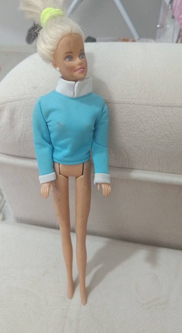 Bebek, beyaz yaka ve manşetlere sahip pastel mavi uzun kollu üst giyiyor. Açık ten rengi ve arkada toplanmış sarı saçları var.