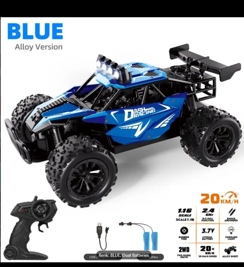 Koyu mavi renkte, off-road lastiklere ve LED ışıklara sahip oyuncak araba. 2WD, 3.7V batarya ve çift USB şarjlı batarya ile çalışır. 2.4 GHz kumanda içerir.