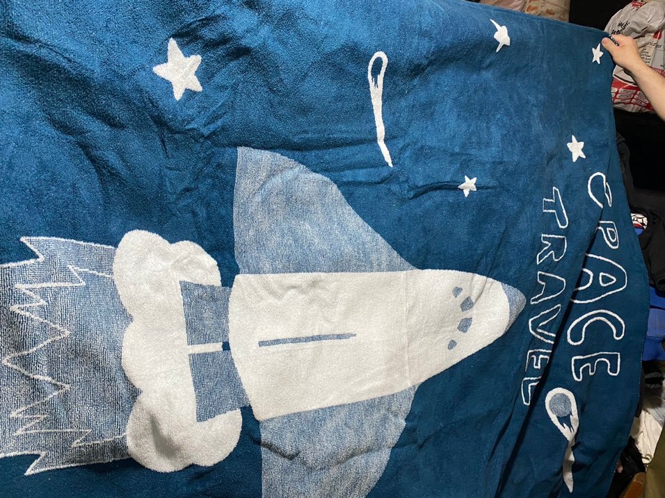 Yumuşak ve sıcak mavi ve gri renklerde, uzay temalı baskılı çocuk battaniyesi. Yıldız ve roket desenleri içerir.