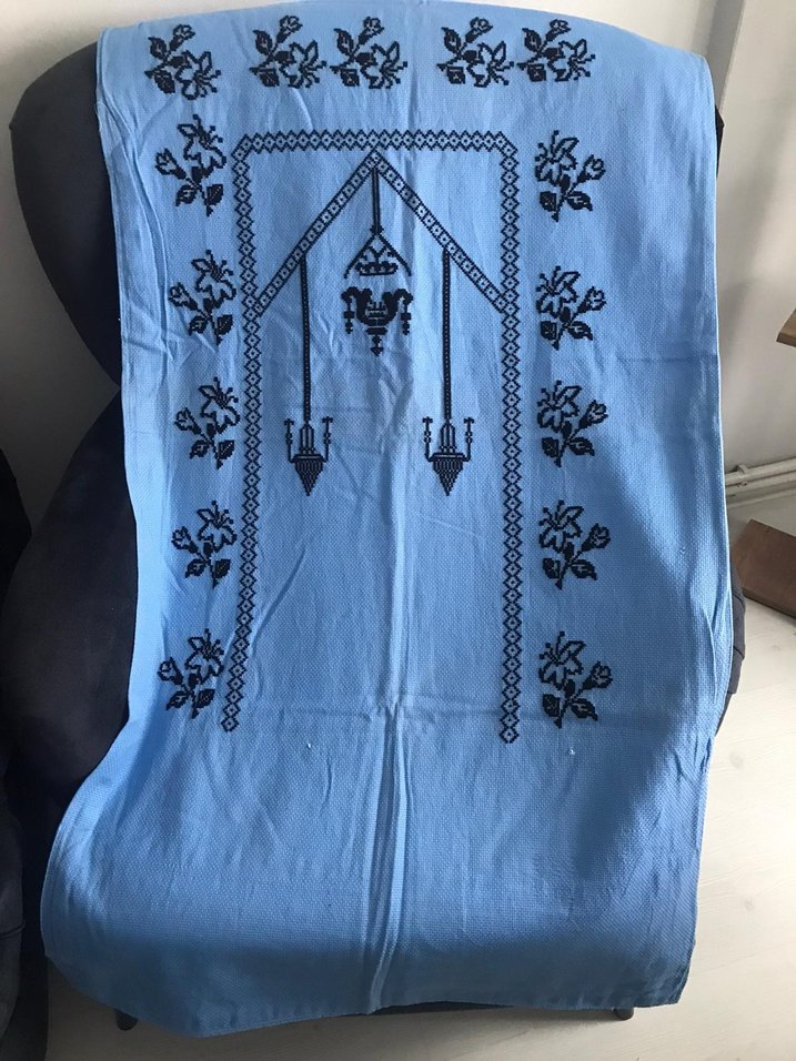 Mavi kumaş üzerinde siyah geleneksel nakışlar, çiçek ve avize desenleriyle el işçiliği sergiler.