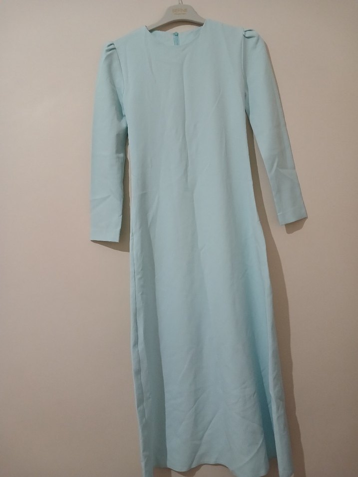 Pastel mavi renkte, uzun kollu, keten kumaştan yapılmış, salaş kesim ve drapeli uzun abiye Minimalist tarzda. 36 beden bebek mavisi