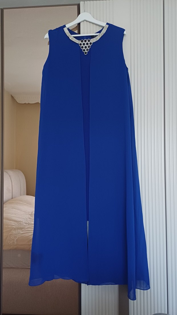 Mavi uzun, kolsuz abiye elbise, satenimsi kumaş ve drapeli tasarıma sahiptir. V yaka, regular fit ve minimalist stilde 1 defa giyildi sorunu yoktur. SON FIYATTIR.