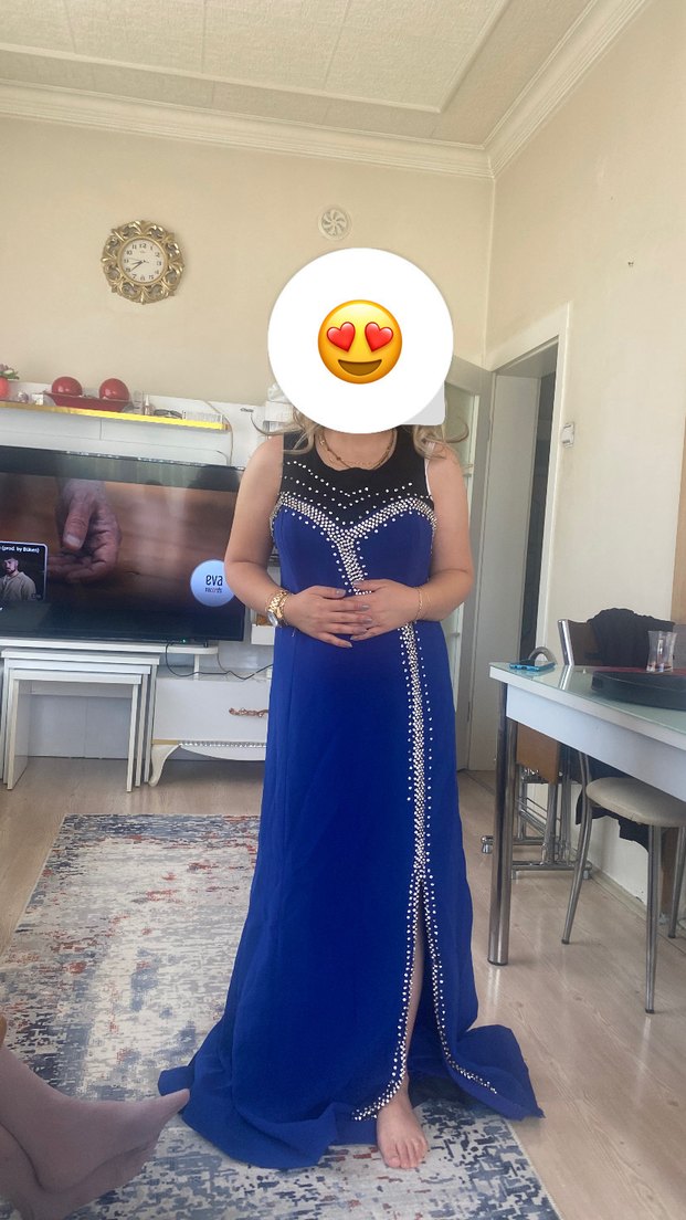 Mavi, uzun, v yaka, kolsuz abiye elbise. Boncuk işlemeli ve parlak dokusu ile partiler için uygundur. Elbise benim bedenim olmadığı için böyle Duruyo sadece çekmek için giydim 67 kg ile giyildi 42 beden Sadece etek kısmında bi iki taş düşmüş o kadar