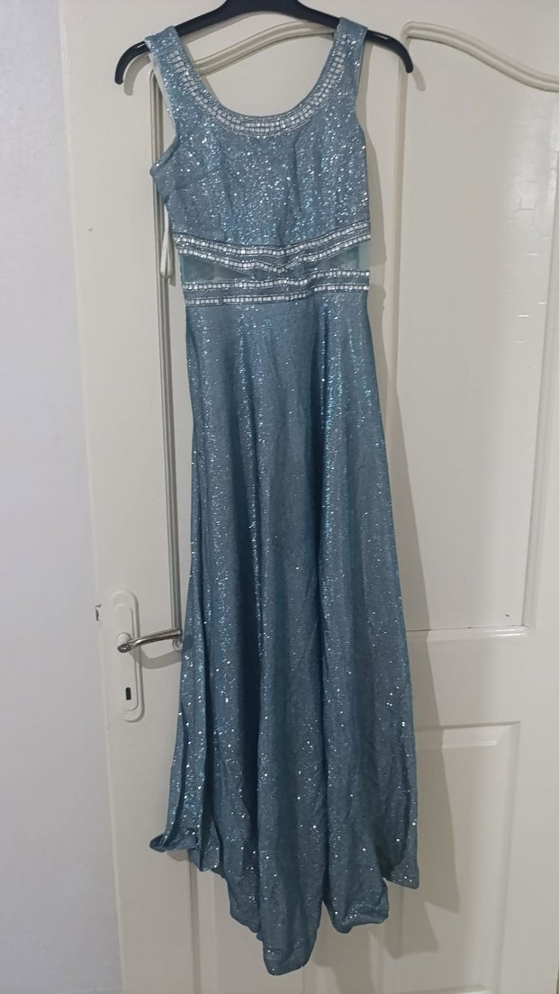 Mavi Uzun Abiye Elbise, Drapeli, Kolsuz