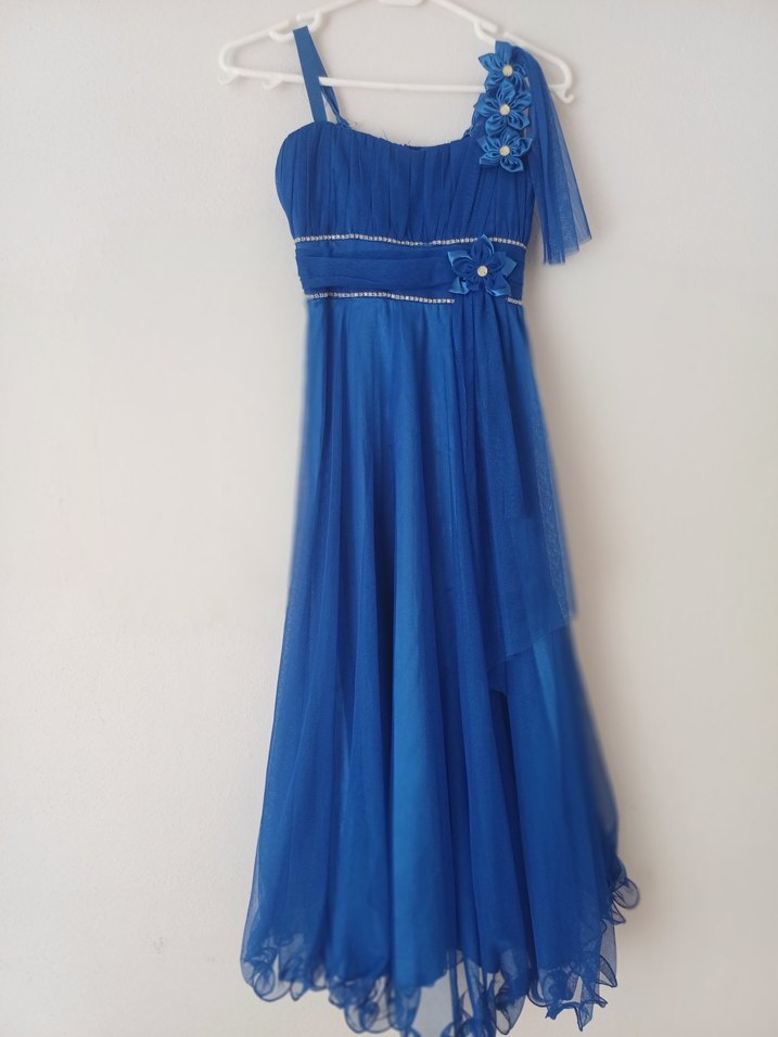 Mavi renkte, nakışlı ve drapeli detaylara sahip, askılı ve uzun boy abiye elbise. Düğünler için uygun klasik ve modern şıklık sunar. Aşkı kısmı değişim istiyor kopukluk vardır biz bağlayıp kullandık değişim yapıp kullanılabilir başka bir yerinde sorun yoktur.