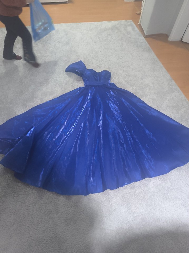 Mavi, askılı ve drapeli uzun abiye elbise. Parlak kumaşı ve bol kesimiyle çağdaş ve göz alıcı bir tarz sunar.