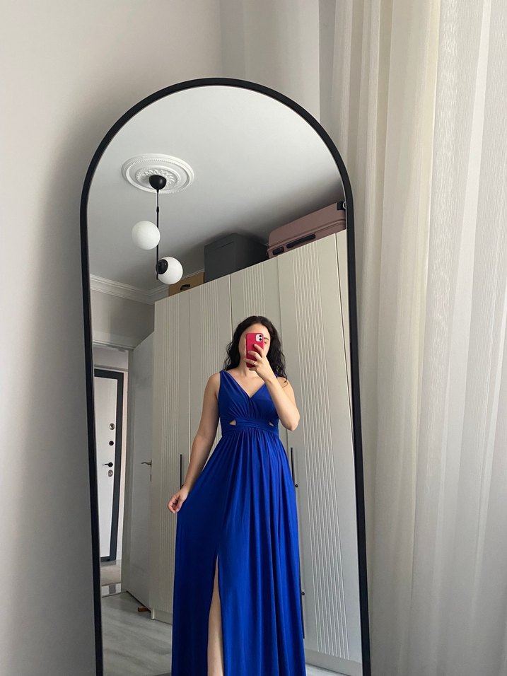 Bu uzun mavi elbise V yaka, bol kesim ve askılı kolludur, bel detayı vardır düğünler için uygundur. Sadece bir kez kullanıldı ✨