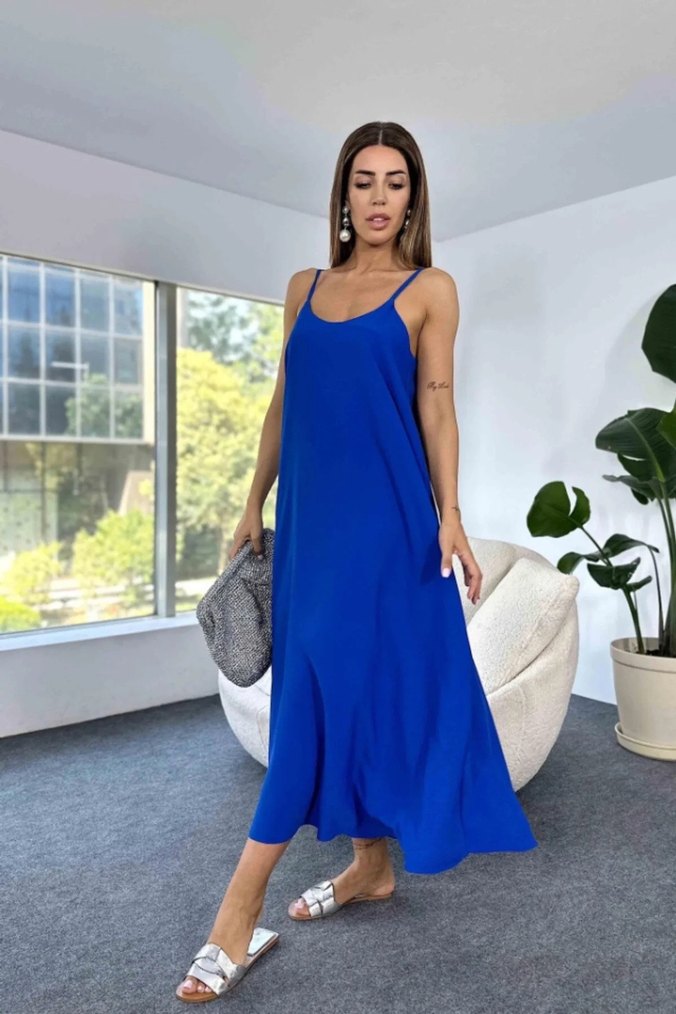 Mavi Uzun Askılı Salaş Elbise