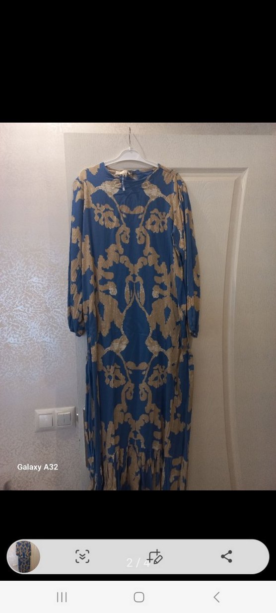 Mavi renkli, bağlama desenli ve bol kesimli uzun elbise. Uzun kollu ve yüksek yakalı, sentetik kumaştan, bohem tarzına uygun.