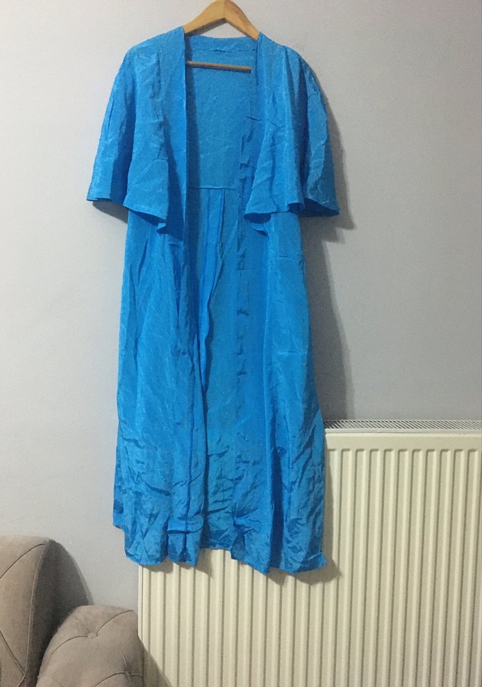 Parlak mavi renkte, uzun ve bol kesim . Vintage bohem tarzında, kolsuz ve desensiz tasarıma sahiptir.