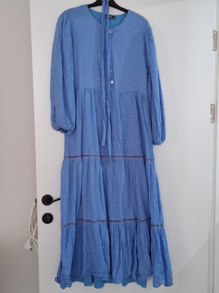 Yumuşak keten kumaştan, pilili detaylı, mavi pastel tonunda, notlu yakalı, bol kesim uzun elbise. Bohem tarz için uygun.