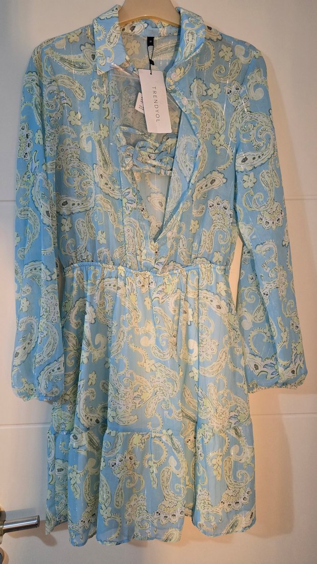 Mavi uzun elbise, bol kesim ve fırfırlı detaylarla. Uzun kollu ve gömlek yaka, romantik akşamlar için uygun. Tie-dye desenli, ipeksi dokulu. sık sımli altı astarllı