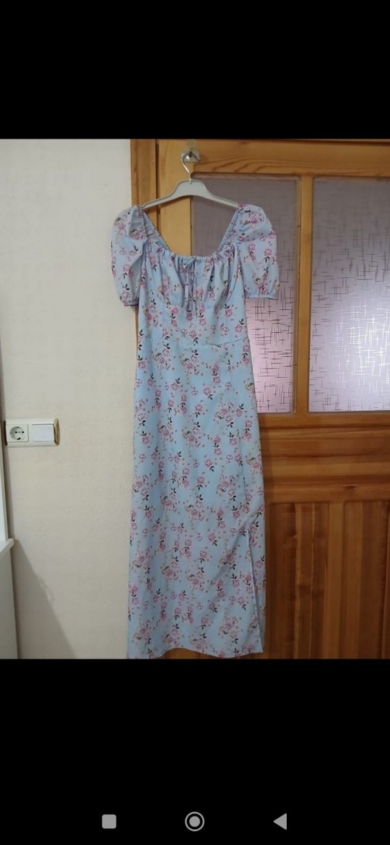Mavi uzun elbise, kısa kollu ve vücuda oturan kesime sahip. Yumuşak sentetik kumaştan, drapeli ve straplez yakalı, günlük bohem tarz için uygun. indirim yaparım