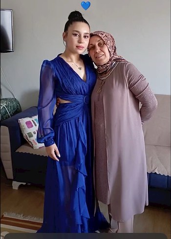 Mavi bohem uzun elbise, drapeli, uzun kollu ve bol kesimdir. V yaka ve etnik desenlerle düğünler için uygundur.