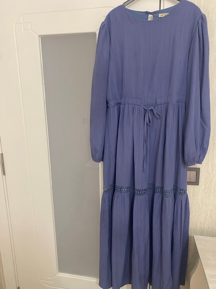 Mavi renkte, keten kumaştan yapılmış uzun, pileli ve bol kesim bir elbisedir. Yuvarlak yaka, uzun kollu ve belinde ayarlanabilir bağcık bulunur.Kumaşı kalitelidir.