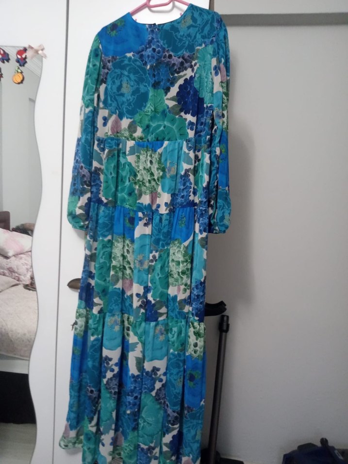 Mavi renkte, bol kesim ve piliseli detaylara sahip uzun elbise. Çiçek desenli batik desenli, uzun kollu ve yuvarlak yakalı, yumuşak sentetik kumaştan.