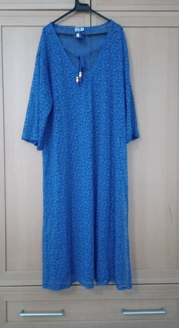 Uzun, mavi, bol kesim pareo, kısa kollu ve V yakalıdır. Boncuk detaylı, yumuşak sentetik kumaştan yapılmıştır.