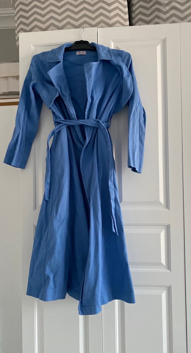 Uzun kollu, bol kesim ve kemerli, düz mavi renkte kadın trençkot . Uzun boy ve sade tasarıma sahiptir.