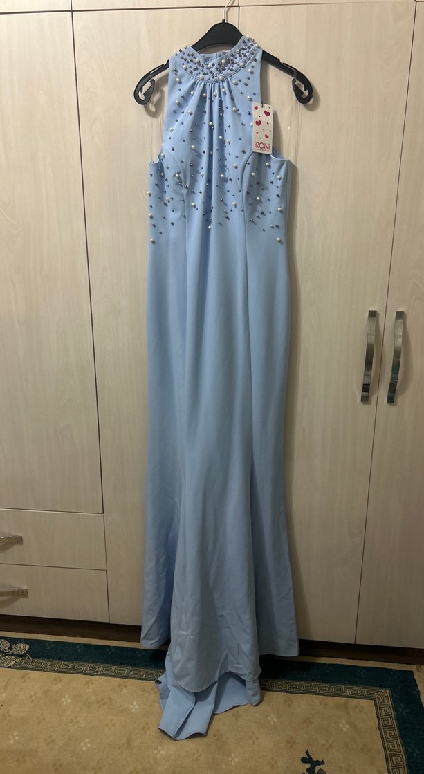 Uzun, pastel mavi renkli, straplez ve kolsuz gece elbisesidir. Boncuk ve işlemeli detaylara sahiptir, klasik ve şık bir görünüm sunar.
