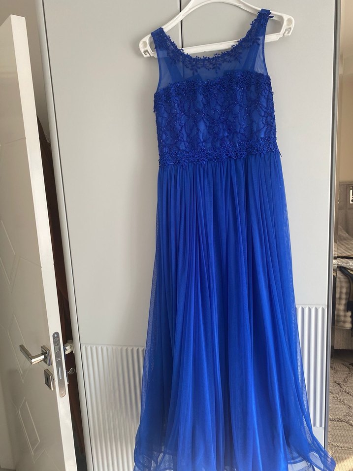 Koyu mavi renkli, dantel işlemeli, kolsuz ve uzun etekli, düğünler için uygun klasik şık abiye elbise.