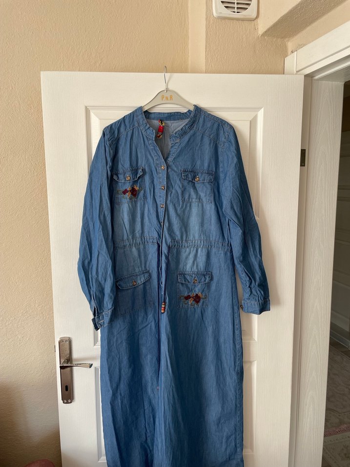 Mavi uzun denim elbise, düğmeli ve nakışlı detaylara sahip. Uzun kollu, yaka kısmı notched lapel, bol kesim ve parlak görünümlü.