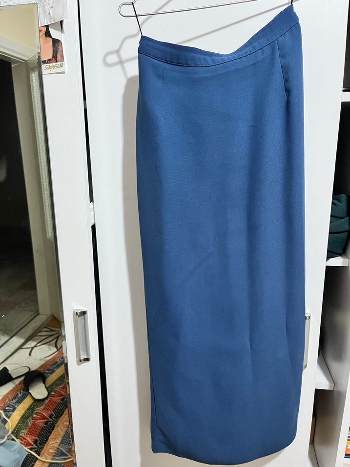 Dökümlü tasarıma sahip uzun mavi etek, düzenli kesim ve yumuşak sentetik kumaştan üretilmiştir. Minimalist ve normcore tarzlara uygundur, ofis için idealdir. Sayfamda yeleği de vardır beraber alınırsa indirim yapabilirim