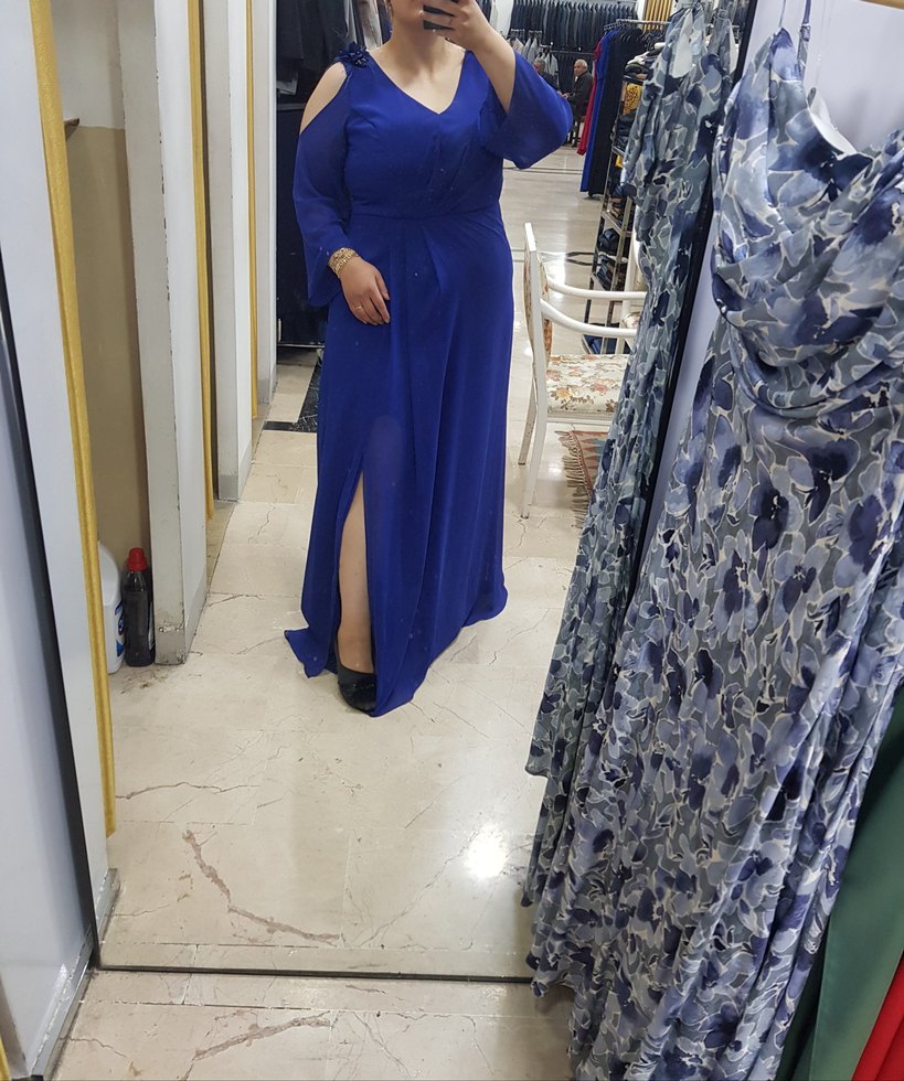 Mavi uzun abiye elbise, drapeli ve bol kesimdir. V yaka ve askılı kollara sahiptir. Parlak kumaşı ve yırtmaç detayıyla şık bir görünüm sunar.