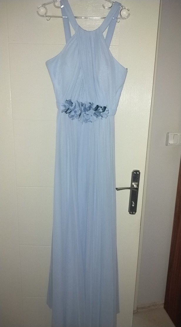 Pastel bebe mavi uzun, drapeli ve askılı kadın abiye. çiçek detayları belde, kolsuz ve vücuda oturan iki ön iki arkada yere uzanan tül detaylılariyla şıklık sunar.