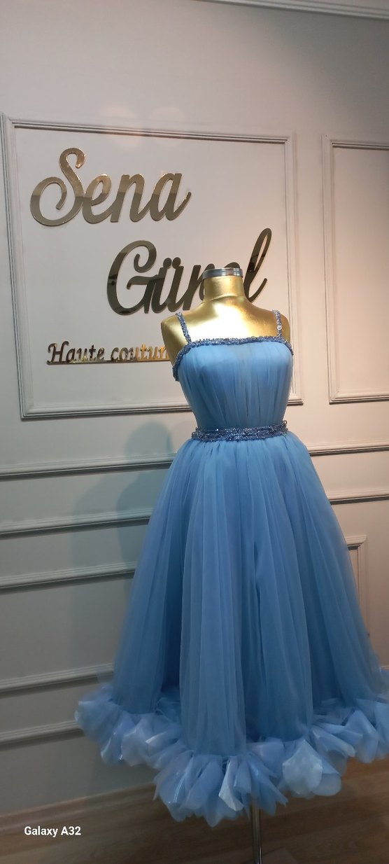 Parlak mavi renkte, drapeli tasarıma sahip, kayık yaka ve askılı kollu uzun düğün elbisesi. Modern klasik tarzda, rahat kesim sunar. 36 38 bedene uyumlu