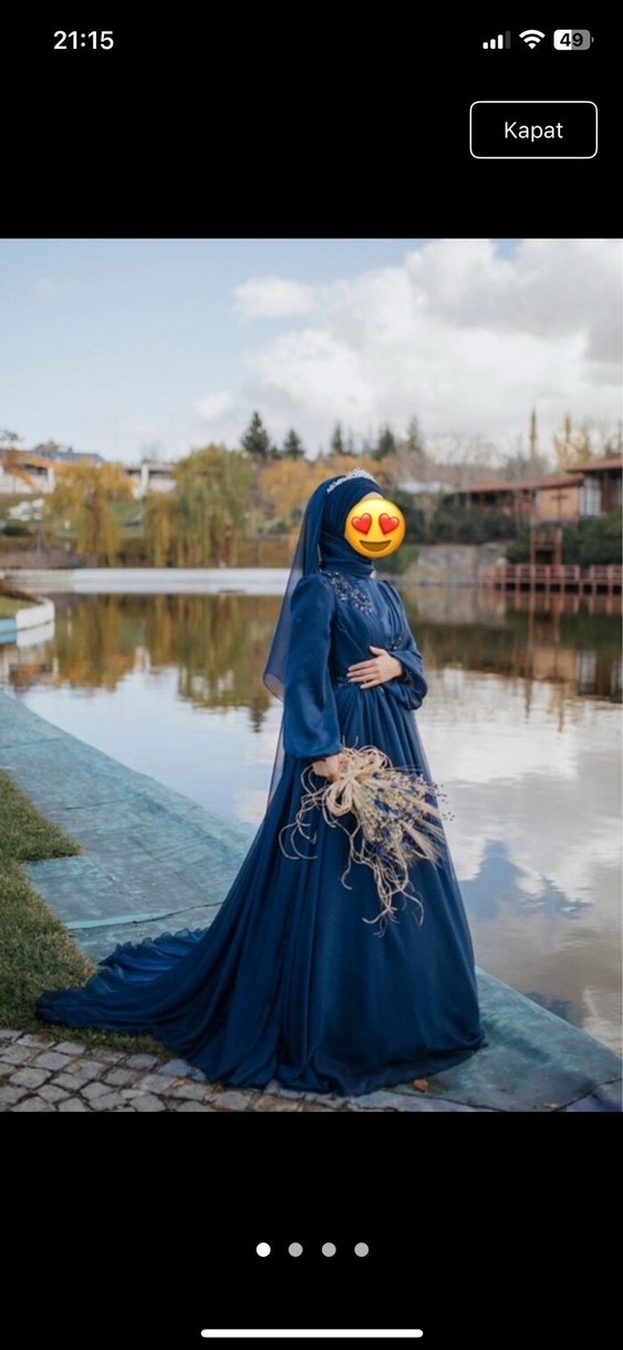 Uzun, koyu mavi renkte, yüksek yakalı ve uzun kollu, bol kesim drapeli henna elbisesi. Hafif batik desenlidir, düğünlerde mütevazı gotik tarz için uygundur. 1 KERE NİŞANDA GİYİLDİ