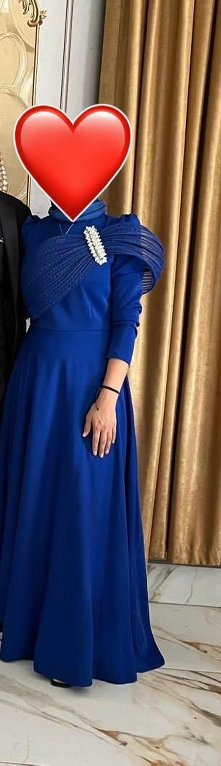 Mavi uzun abiye elbise, drapeli tasarım, kayık yaka ve ince askılarla. Düzenli kesim, parlak ve desensiz kumaş, düğünler için uygun. 1 defa gıyıldı sıfır daha