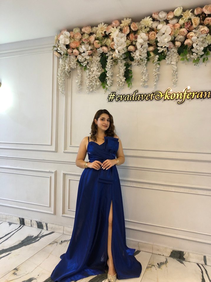 Mavi, uzun, drapeli ve straplez tasarıma sahip bu abiye, düğünler için parlak ve desensiz kumaftan üretilmiştir. 1 kere giyilmiştir . S M L bedenlere uygundur. Pazarlık payı vardır