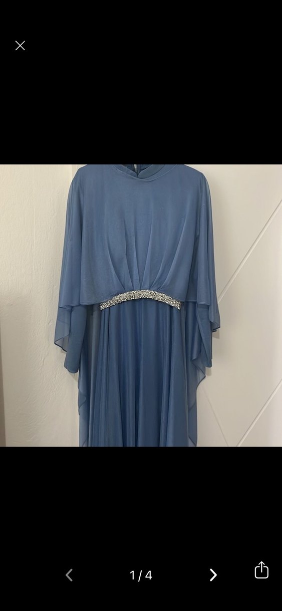 Mavi uzun abiye elbise, drapeli tasarımı, yüksek yakası ve bol kesimi ile dikkat çeker. İnce askılı kollara ve belde zarif süslemesine sahiptir. Minimalist ve çağdaş bir tarza sahiptir.