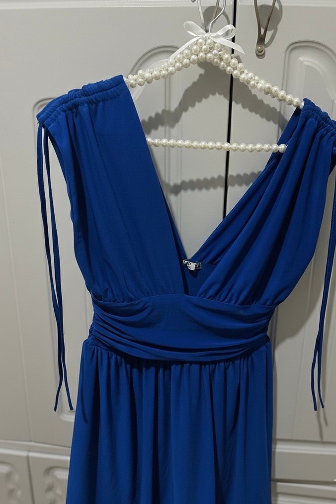 Bu kadın abiye elbise, parlak mavi renkte, V yakalı ve drapeli detaylara sahiptir. İnce askılı kolları ve uzun boyu ile modern klasik tarzda, Paris esintili şıklık sunar.