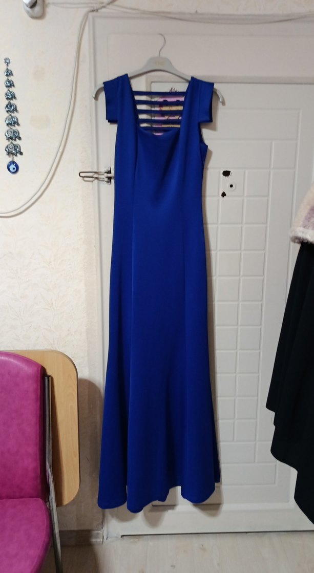 Mavi Uzun Drapeli Kadın Abiye Elbise