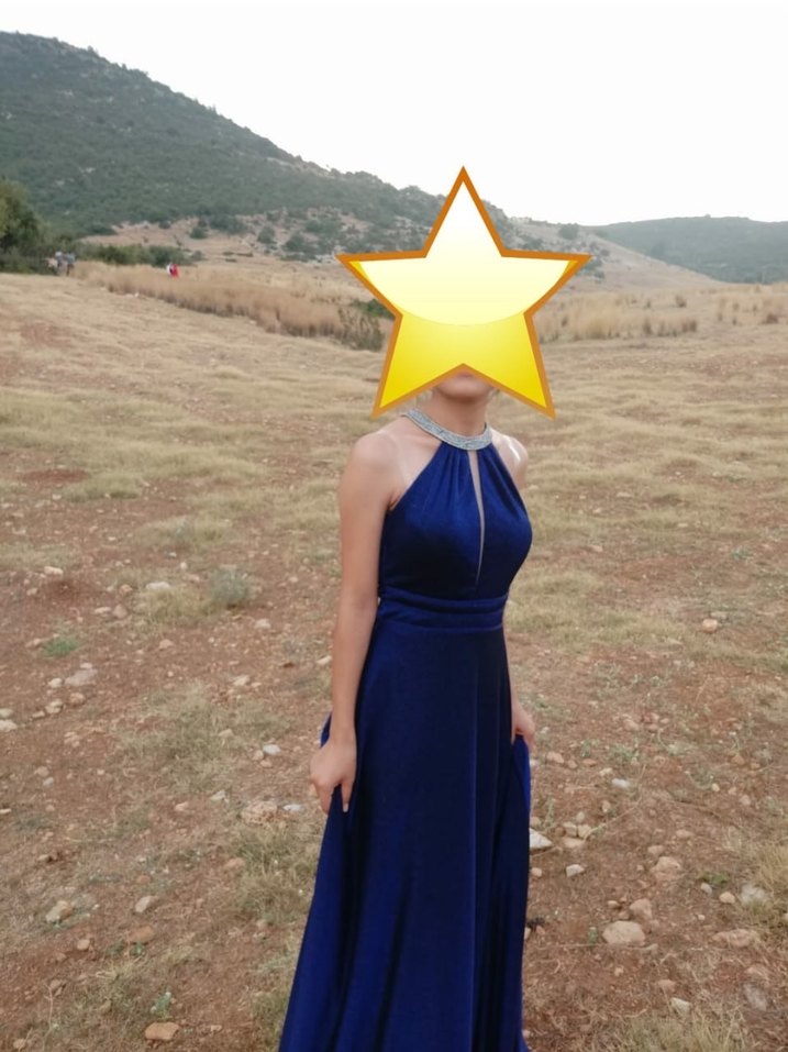 Fitted kesim, uzun mavi abiye elbise yüksek yakalı ve askılı kolludur. Drapeli tasarımı ve parlak dokusuyla gösterişli partilere uygundur. ✨bedeni 38 idi ben 36 olacak şekilde daralttım 1 kere giyildi