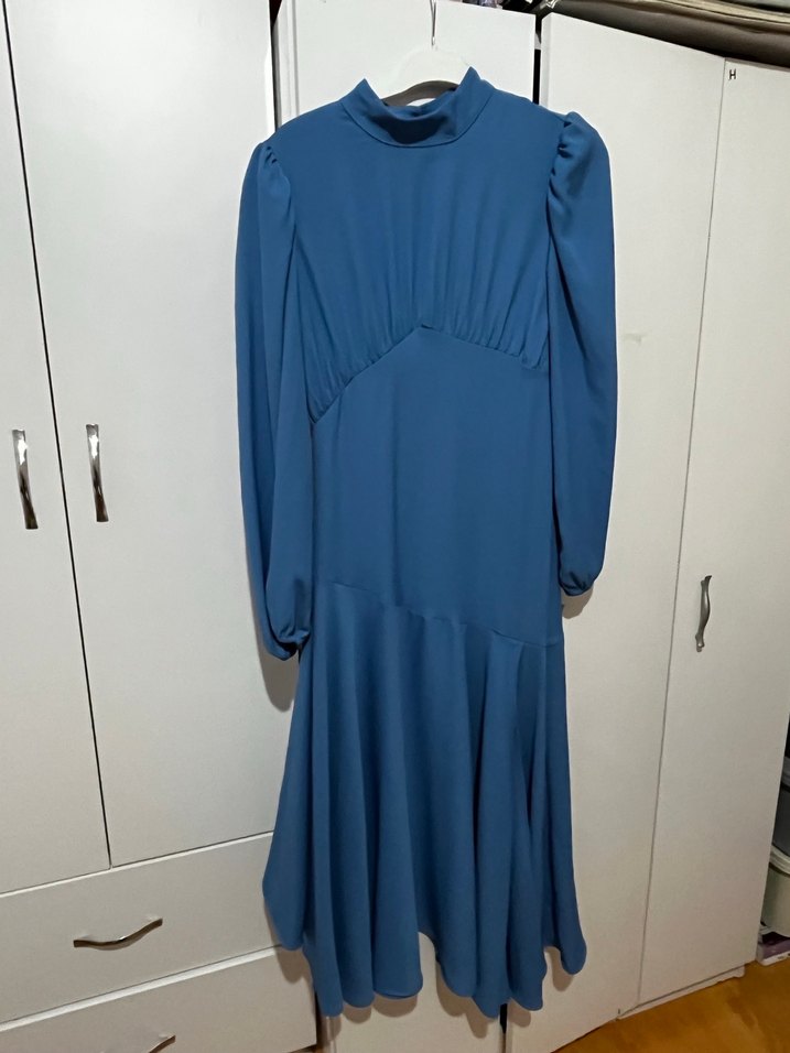 Mavi uzun elbise, yüksek yaka ve uzun kollu, bol kesim ve drapeli detaylara sahip. Sentetik kumaştan yapılmış, modern klasik Paris tarzını yansıtıyor. Herhangi bir defo ya da tadilat yok