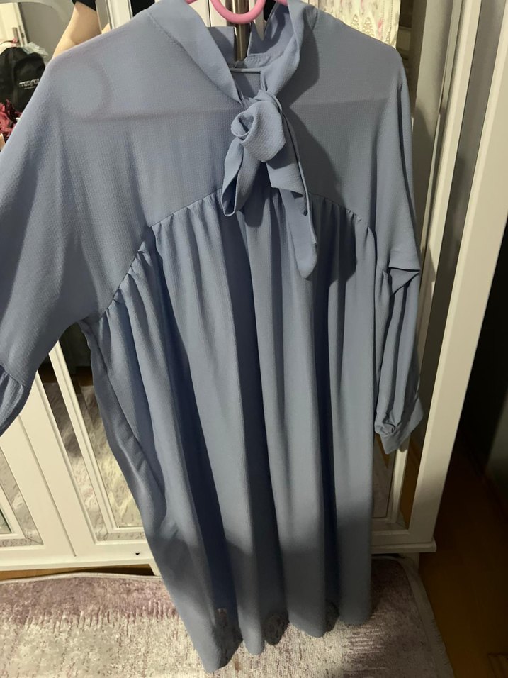 mavi renkte, uzun ve bol kesim kadın tunik. Drapeli detayları ve yüksek yakasıyla sade, günlük kullanıma uygun minimal tasarım sunar.