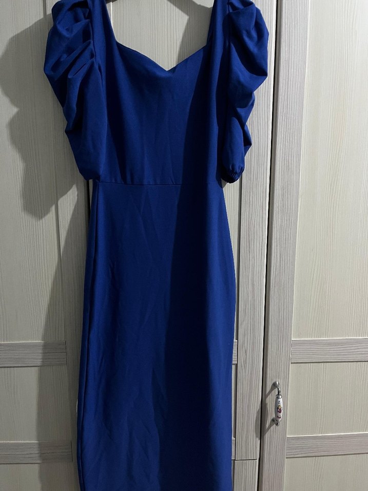 Mavi Uzun Drapeli kare Yaka Kadın Elbise