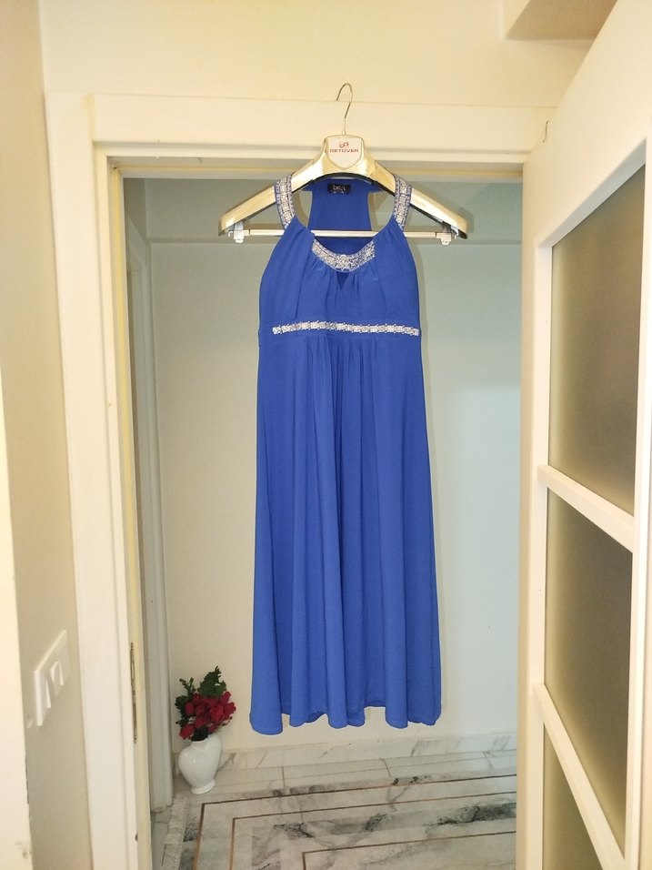 Mavi, straplez kısa abiye elbise, bol kesim ve drapeli tasarıma sahip. Düğün gibi bohem tarz etkinlikler için uygun, parlak detayları bulunur.