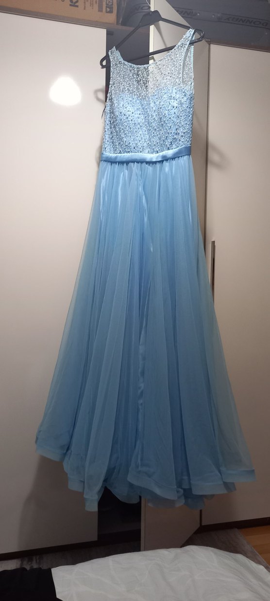 Fitted kesim, straplez ve drapeli pastel mavi etekli, payetli üst kısmı ile düğün ve özel günlere uygun abiye elbise.