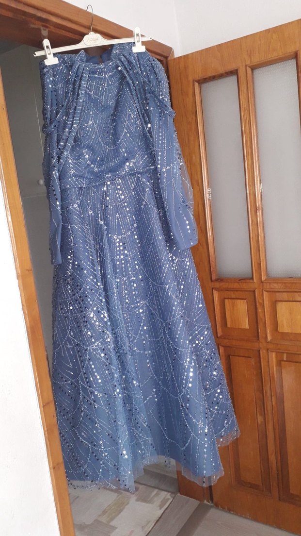 Bu uzun mavi abiye elbise, straplez yaka ve drapeli tasarıma sahiptir. İşlemeli parlak detaylarla süslenmiş, düzenli kesim ve kolsuzdur, düğünler için uygundur.