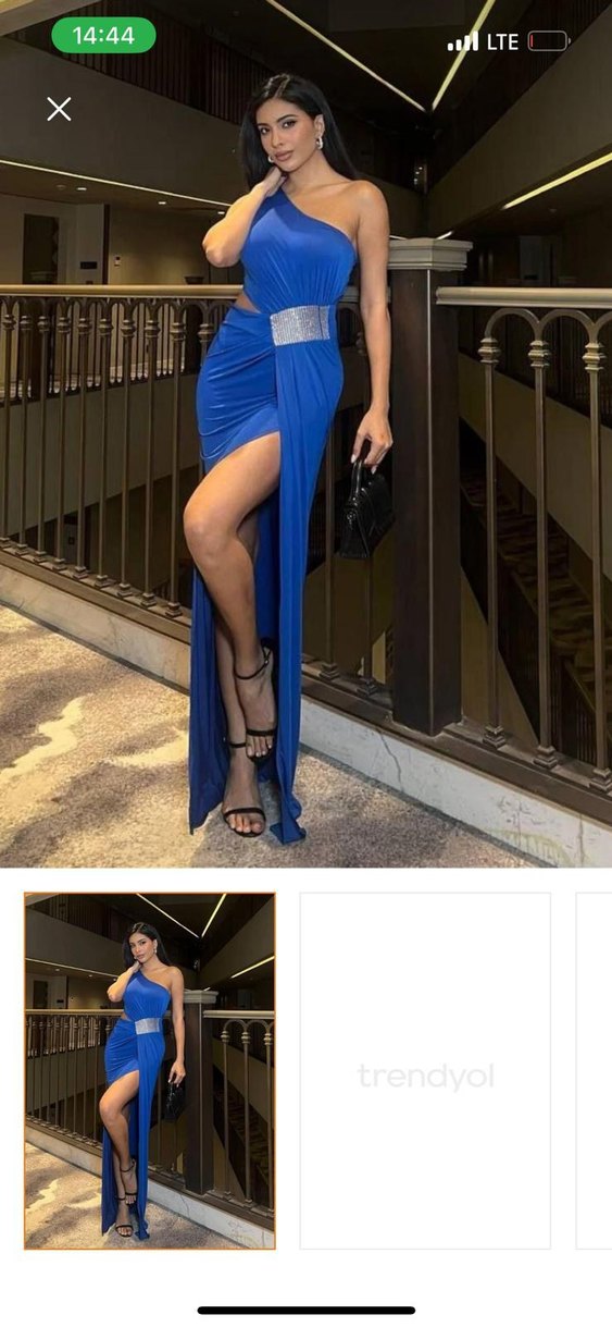 Bu mavi uzun elbise, straplez yakası, drapeli detayları ve yüksek yırtmaç ile dikkat çeker. İnce askılı ve çağdaş, gösterişli bir tasarıma sahiptir. ✨