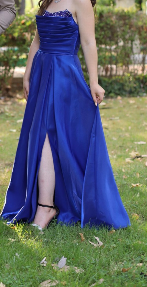 Uzun, fitted mavi mezuniyet elbisesi straplez yaka ve drapeli detaylara sahiptir. Parlak kumaşıyla düğün ve özel günler için uygundur. Boyunu biraz kestirdim , 1.55 1.65 boylar için uygundur Fiyatta yardımcı olurum sadece bir kere giyildi