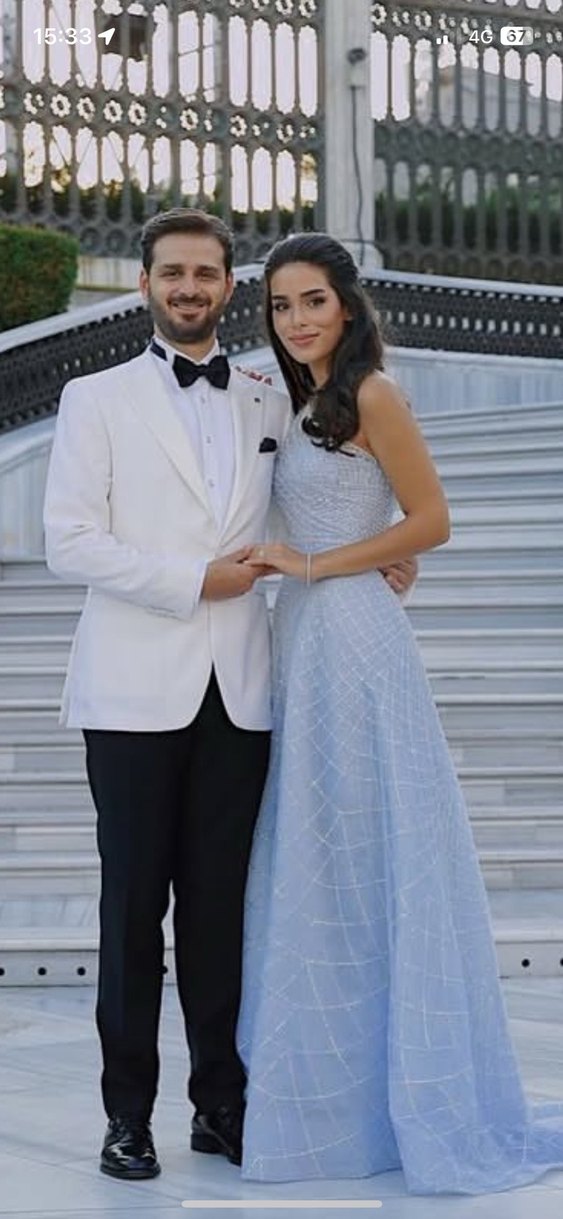 Nişan için tasarlanmış, mavi parlak kumaştan, drapeli ve straplez uzun elbise, klasik zarafet ve bohem stili bir araya getirir.