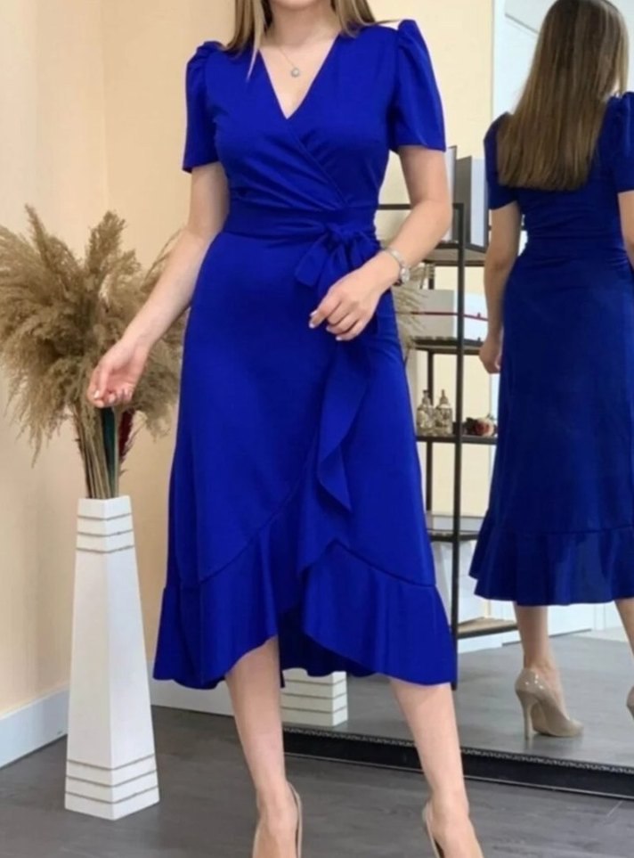 Koyu mavi, drapeli detaylı, kısa kollu ve V yakalı, vücuda oturan uzun kadın elbisesi. Minimalist sokak stili için uygundur.