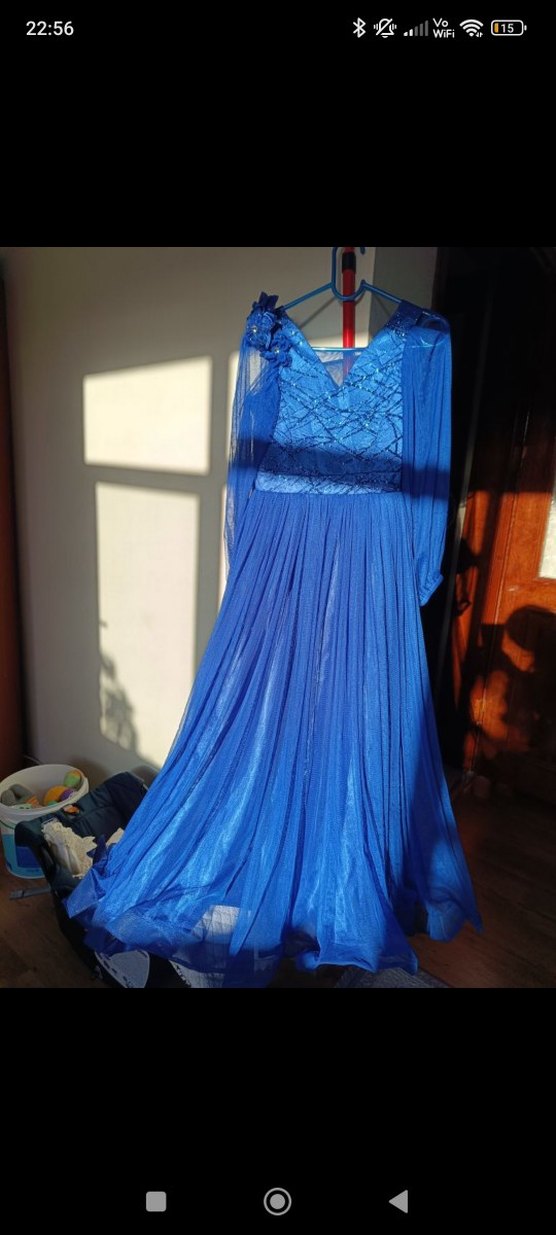 Mavi, uzun ve drapeli kadın elbisesi, V yakalı ve kolsuzdur. Parlak dokusu ve bohem tarzıyla düğünler için uygundur.