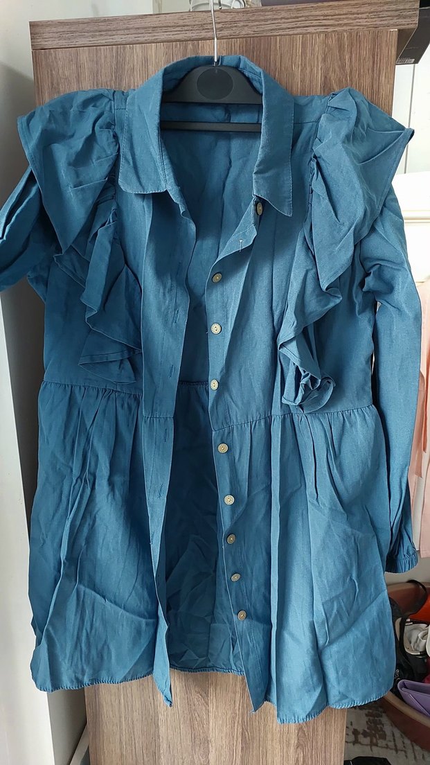 Parlak mavi keten hamile ceketi, düğmeli ön ve uzun kollarla bol kesim. Fırfır detaylı, bohem Paris tarzını yansıtan gündelik kullanıma uygun bir parça.