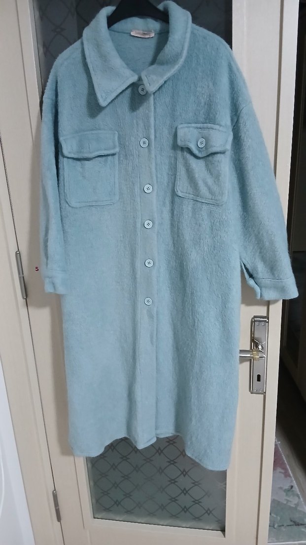 Pastel mavi renkte, uzun ve bol kesim kadın kaban. Düğmeli ve kesik yakalı, yumuşak ve sıcak dokulu kumaştan üretilmiştir. Rahat ve gündelik stil için uygundur. İtalya dan alınmış temizdir, marka ürün resimde açıklama yaptığım gibi bir cep düğmesi eksik onuda en üst düğmesi çıkarıp dikilmesi önerimdir. yada diğerini de çıkarmak mümkün. boy 115 iki göğüs arası 64 saks mavi tatlı bir rengi var.