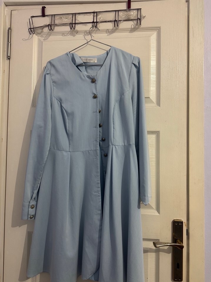 Pastel mavi uzun hamile kabanı, düğmeli ön ve kesimli yaka detayına sahiptir. Rahat kesim ve uzun kolludur.